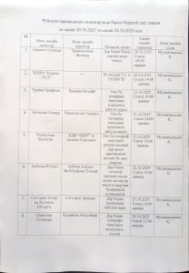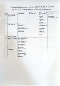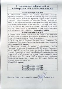 Рӯйхати парвандаҳои таъингардида барои баррасӣ дар давраи аз санаи 20.10.2025 то санаи 24.10.2025 сол.