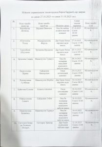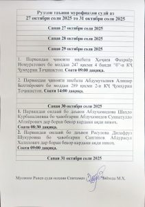 Рӯйхати парвандаҳои таъингардида барои баррасӣ дар давраи аз санаи 27.10.2025 то санаи 31.10.2025 сол.
