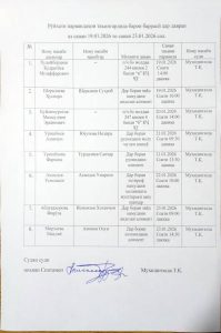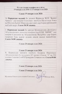 26 января 2026 года на выездном судебном заседании, состоявшемся в центральной библиотеке Спитаменского района имени Камоли Худжанди, заместитель председателя Спитаменского районного суда Зиёзода М.Ҳ. рассмотрел семейные дела, в том числе иск Бозоровой Сабринахон Боймуродовны к ответчику Абдурасулова Хусниддина Наджмиддиновича об увеличении размера алиментов, установленных судом, и иск Чуаева Зарифа Боймуродовича к ответчику Чониевы Сарвиноз Абдумаликовны о расторжении брака.
