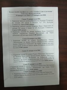 Рассмотрение уголовного дела против Абдуазимова Козикула Рахмоновича по статье 212 части 2 Уголовного кодекса Республики Таджикистан на выездном судебном заседании, состоявшемся в центральной библиотеке Спитаменского района имени Камоли Худжанди, под председательством судьи Спитаменского районного суда Мухаммадалии Куватали, 9 февраля 2026 года.